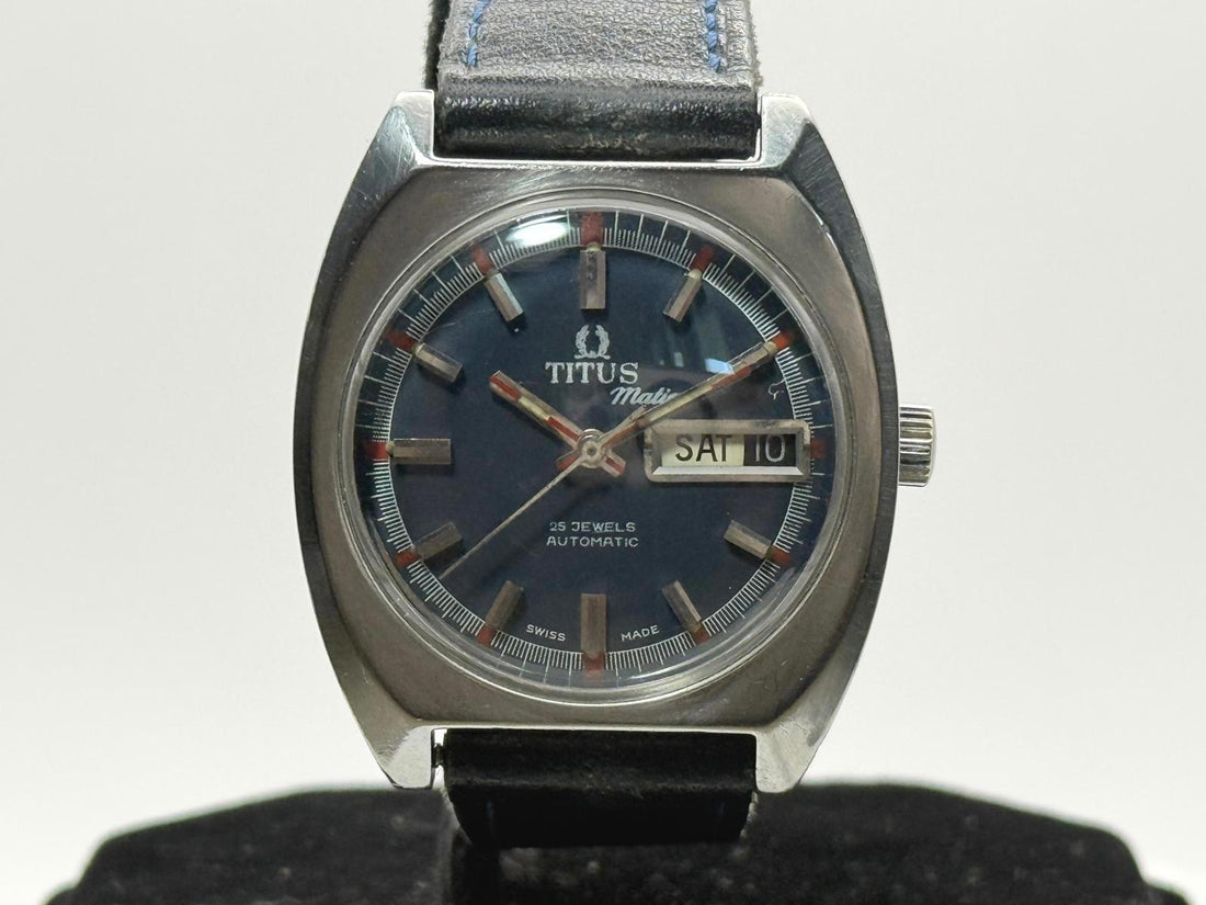 Vintage Titus Matic 8954 Automatic 34mm Blue Dial Day Date Swiss Watch Runs