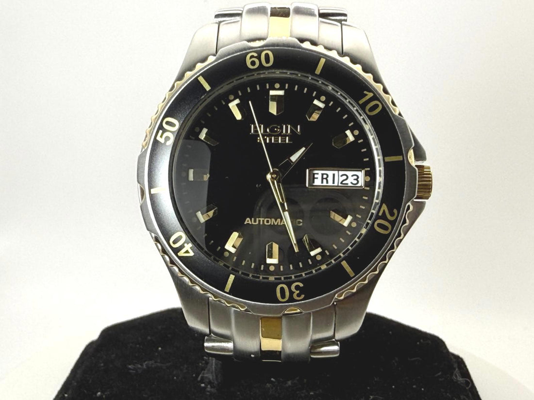 Elgin Automatic Diver 165FT 39mm Day Date Two Tone Black Dial Watch Runs
