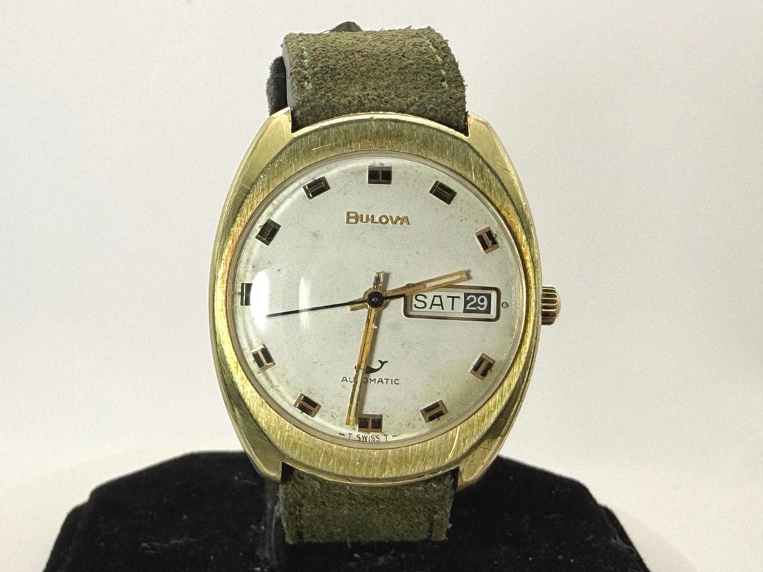 Vintage Bulova Automatic Day Date H262457 33mm Gold Cushion Case Runs