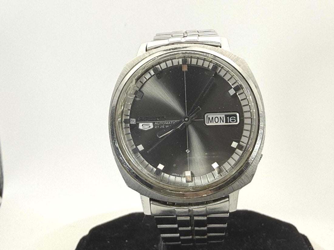 Seiko 5 6119-6003 Automatic TV Case Black Dial Runs 36mm Vintage