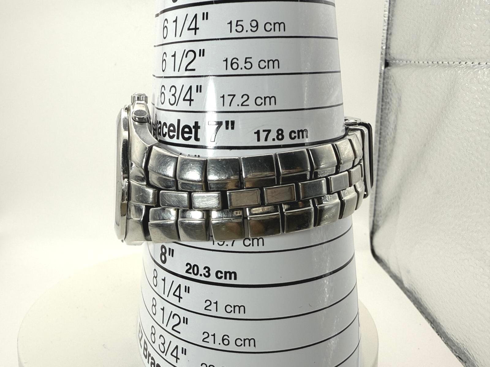 Watch is in good condition. The case and bracelet have scratches. There are 2 hit marks on the clasp. Crystal is clean and free of scratches. Watch runs as of 10/30/25. I do not have the box or paperwork.
