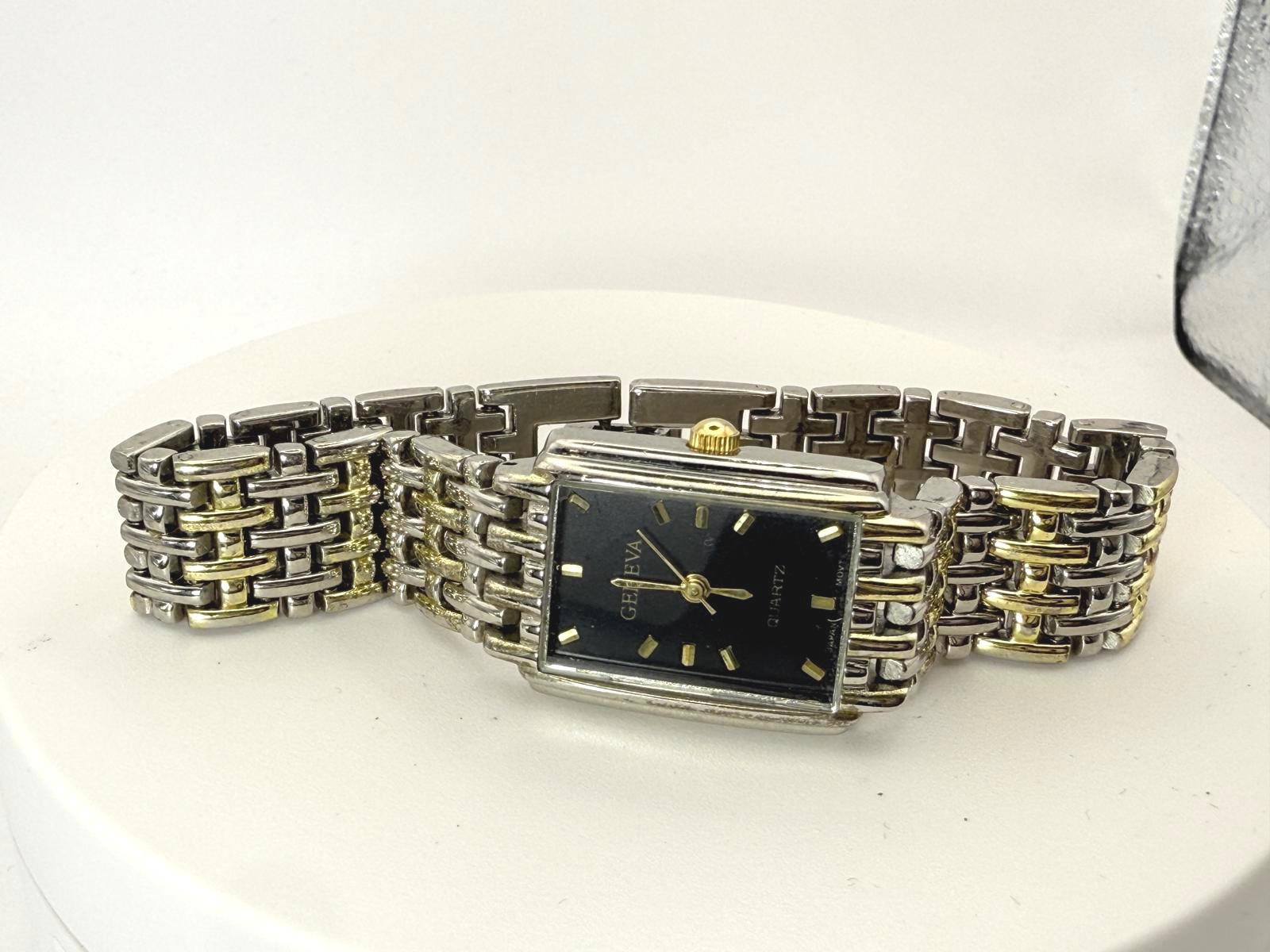 Geneva Quartz Rectangular Watch Black Dial Silver Bracelet New Battery 20mm